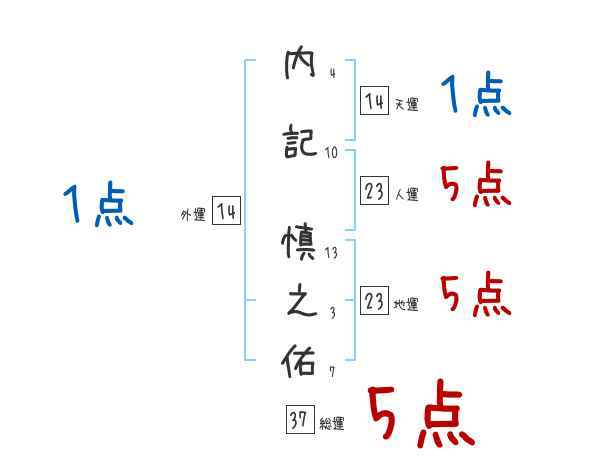 天運![]() | 内記慎之佑さんの天運は14画の1つ星!人に対して優しいがストレスを溜め込みがち。人間関係のトラブルを避けるよう気をつけましょう。 家系が持つ宿命的な運勢を表します。祖先から受け継いだ苗字ですので自分の力が及びません。家柄を象徴します。 |