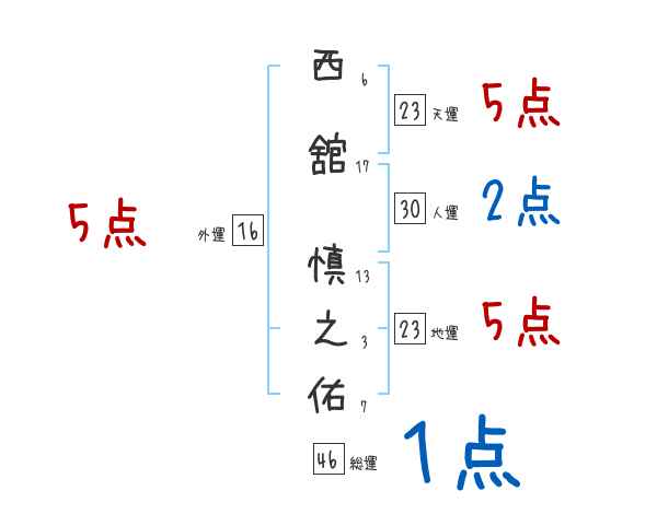 天運![]() | 西舘慎之佑さんの天運は23画の5つ星!想像力に優れ活力がある。一代で成功し名誉を手に入れる。 家系が持つ宿命的な運勢を表します。祖先から受け継いだ苗字ですので自分の力が及びません。家柄を象徴します。 |