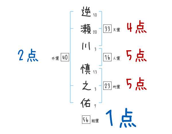 人運![]() | 逆瀬川慎之佑さんの人運は16画の5つ星!人望が厚く大きく発展する。逆転成功が見える。 性格や才能などを表す2番目に重要な運勢です。人間関係や協調性、社会的な成功に影響します。主に20歳から50歳ぐらいまでの中年期の運勢を表します。 |