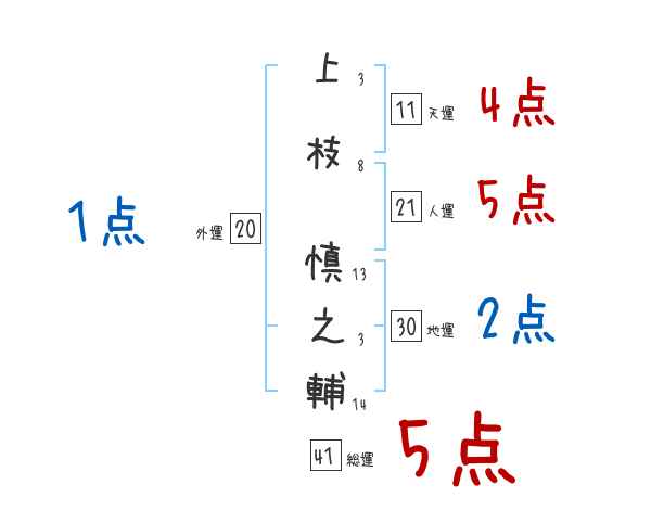 天運![]() | 上枝慎之輔さんの天運は11画の4つ星!着実に富や地位を得る幸運な人生。 家系が持つ宿命的な運勢を表します。祖先から受け継いだ苗字ですので自分の力が及びません。家柄を象徴します。 |