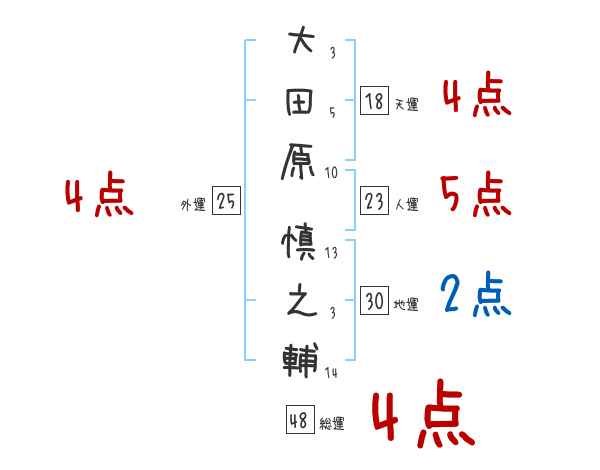 天運![]() | 大田原慎之輔さんの天運は18画の4つ星!情熱的で剛気。忍耐力があり信頼される。 家系が持つ宿命的な運勢を表します。祖先から受け継いだ苗字ですので自分の力が及びません。家柄を象徴します。 |
