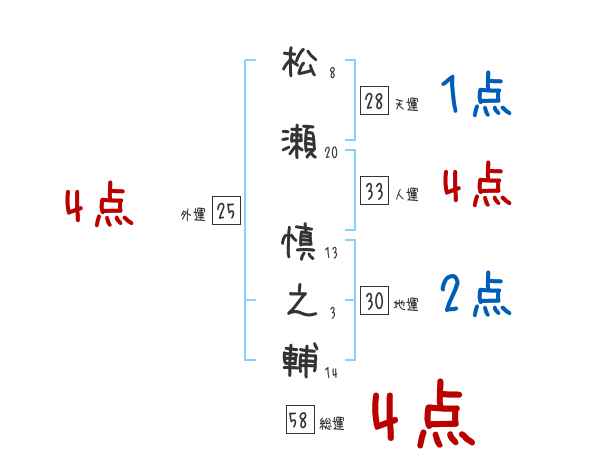 総運![]() | 松瀬慎之輔さんの総運は58画の4つ星!安定した生活。大器晩成タイプ。 あなたの人生を表す1番重要な運勢です。生涯を通じて影響する総合運となり、主に50歳以降の晩年期に影響を及ぼします。 |