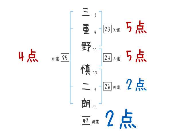 天運![]() | 三重野慎二朗さんの天運は23画の5つ星!想像力に優れ活力がある。一代で成功し名誉を手に入れる。 家系が持つ宿命的な運勢を表します。祖先から受け継いだ苗字ですので自分の力が及びません。家柄を象徴します。 |