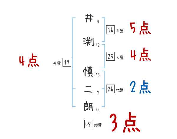 外運![]() | 井渕慎二朗さんの外運は17画の4つ星!積極的な行動力。地位を気づき財産を手に入れる。純粋な心と直感力。 生活面を象徴する運勢です。外部から受ける影響力を表し、結婚運、家庭運や職場、環境への順応性を表します。 |
