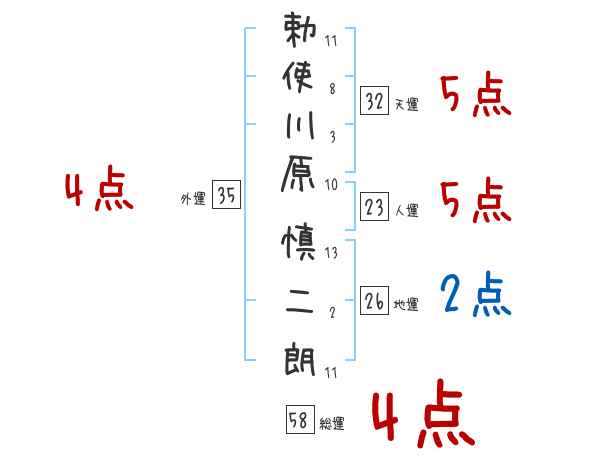 天運![]() | 勅使川原慎二朗さんの天運は32画の5つ星!柔軟性があり成功する。チャンスが多く金運が良い。 家系が持つ宿命的な運勢を表します。祖先から受け継いだ苗字ですので自分の力が及びません。家柄を象徴します。 |