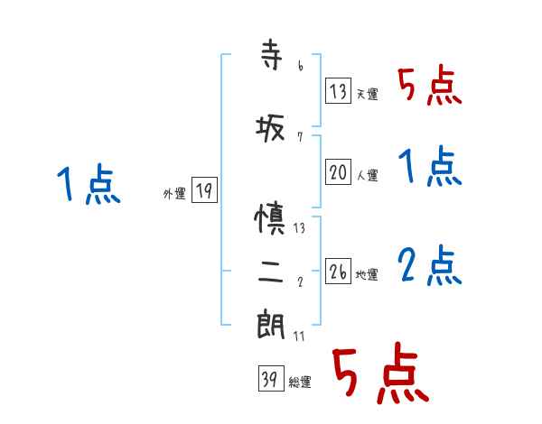 総運![]() | 寺坂慎二朗さんの総運は39画の5つ星!社交性に優れ人望が厚い。人の上に立ち成功する。 あなたの人生を表す1番重要な運勢です。生涯を通じて影響する総合運となり、主に50歳以降の晩年期に影響を及ぼします。 |