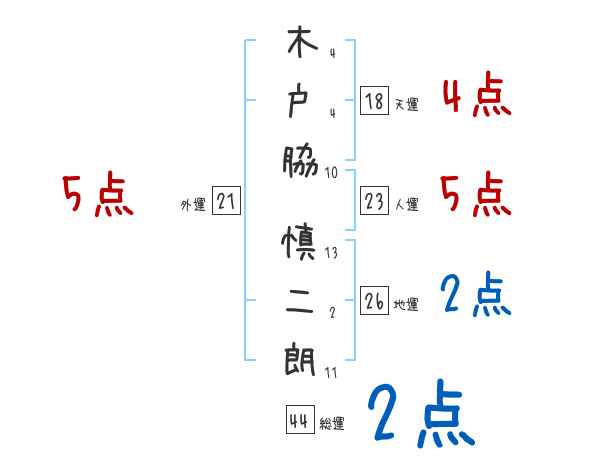 人運![]() | 木戸脇慎二朗さんの人運は23画の5つ星!想像力に優れ活力がある。一代で成功し名誉を手に入れる。 性格や才能などを表す2番目に重要な運勢です。人間関係や協調性、社会的な成功に影響します。主に20歳から50歳ぐらいまでの中年期の運勢を表します。 |