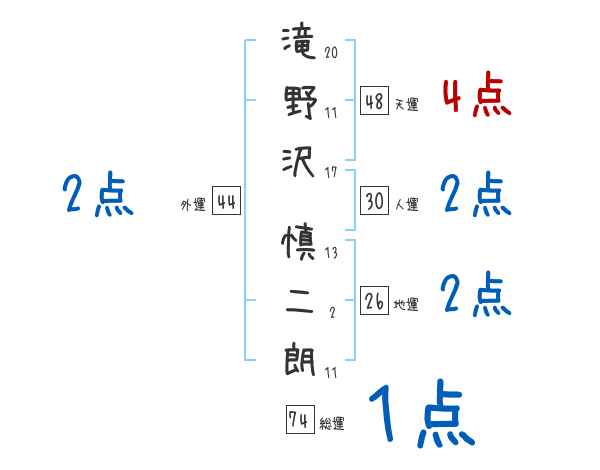 総運![]() | 滝野沢慎二朗さんの総運は74画の1つ星!無気力で怠惰な生活送りがち。規則正しい生活を送るよう気をつけましょう。 あなたの人生を表す1番重要な運勢です。生涯を通じて影響する総合運となり、主に50歳以降の晩年期に影響を及ぼします。 |