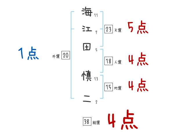 天運![]() | 海江田慎二さんの天運は23画の5つ星!想像力に優れ活力がある。一代で成功し名誉を手に入れる。 家系が持つ宿命的な運勢を表します。祖先から受け継いだ苗字ですので自分の力が及びません。家柄を象徴します。 |