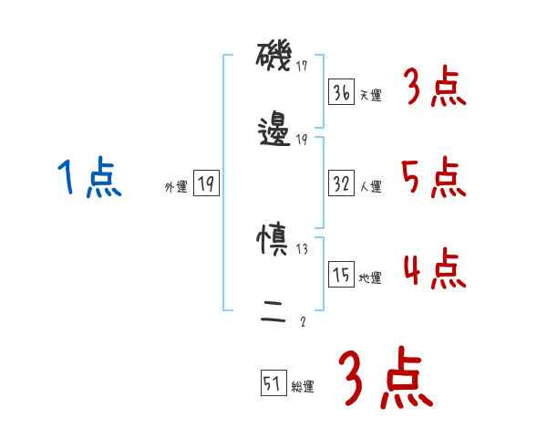 人運![]() | 磯邊慎二さんの人運は32画の5つ星!柔軟性があり成功する。チャンスが多く金運が良い。 性格や才能などを表す2番目に重要な運勢です。人間関係や協調性、社会的な成功に影響します。主に20歳から50歳ぐらいまでの中年期の運勢を表します。 |