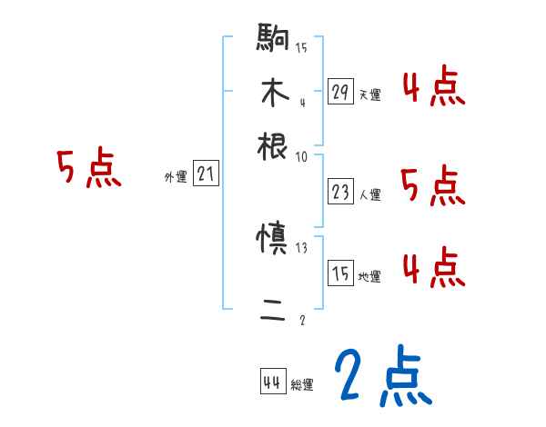 総運![]() | 駒木根慎二さんの総運は44画の2つ星!誠実で慎重な性格。物事を考えすぎないように注意しましょう。 あなたの人生を表す1番重要な運勢です。生涯を通じて影響する総合運となり、主に50歳以降の晩年期に影響を及ぼします。 |