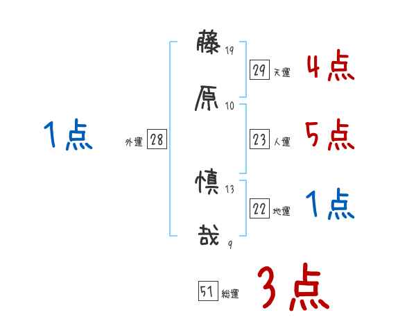 天運![]() | 藤原慎哉さんの天運は29画の4つ星!完全主義で才能がある。厳格な心の持ち主。 家系が持つ宿命的な運勢を表します。祖先から受け継いだ苗字ですので自分の力が及びません。家柄を象徴します。 |