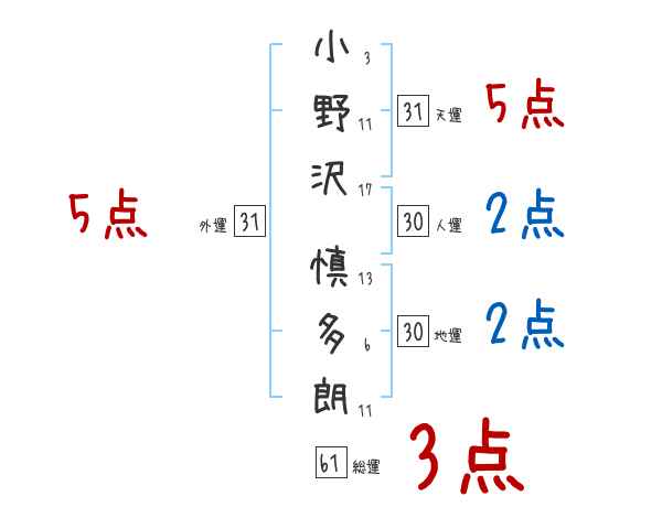 天運![]() | 小野沢慎多朗さんの天運は31画の5つ星!社交性があり判断力に優れる。順風満帆な人生で円満な生活。 家系が持つ宿命的な運勢を表します。祖先から受け継いだ苗字ですので自分の力が及びません。家柄を象徴します。 |