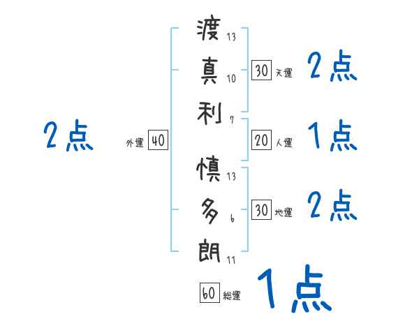 総運![]() | 渡真利慎多朗さんの総運は60画の1つ星!悲観的で迷いやすい。波乱が多く損をしないように。 あなたの人生を表す1番重要な運勢です。生涯を通じて影響する総合運となり、主に50歳以降の晩年期に影響を及ぼします。 |
