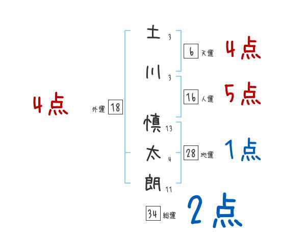 天運![]() | 土川慎太朗さんの天運は6画の4つ星!慎重な努力家で信頼を得る。誠実な精神で向上心に優れる。 家系が持つ宿命的な運勢を表します。祖先から受け継いだ苗字ですので自分の力が及びません。家柄を象徴します。 |