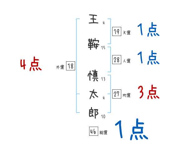 外運![]() | 王鞍慎太郎さんの外運は18画の4つ星!情熱的で剛気。忍耐力があり信頼される。 生活面を象徴する運勢です。外部から受ける影響力を表し、結婚運、家庭運や職場、環境への順応性を表します。 |
