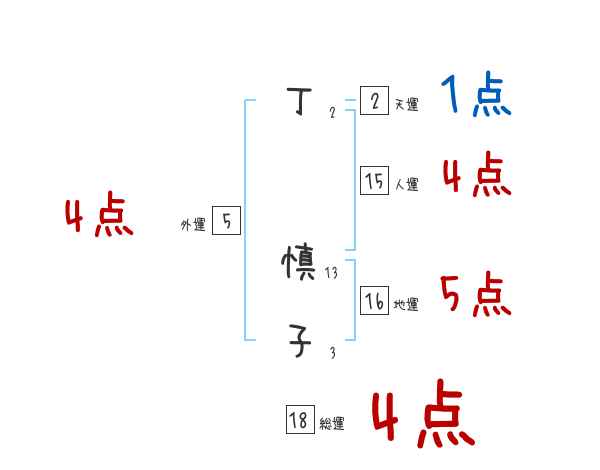 外運![]() | 丁慎子さんの外運は5画の4つ星!健康で安泰。協調性に優れ、財産に恵まれる。 生活面を象徴する運勢です。外部から受ける影響力を表し、結婚運、家庭運や職場、環境への順応性を表します。 |