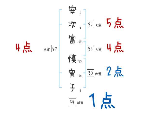 天運![]() | 安次富慎実子さんの天運は24画の5つ星!家庭運が良く順調な人生。金運にも恵まれる。 家系が持つ宿命的な運勢を表します。祖先から受け継いだ苗字ですので自分の力が及びません。家柄を象徴します。 |