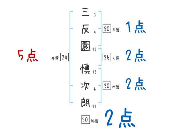 外運![]() | 三反園慎次朗さんの外運は24画の5つ星!家庭運が良く順調な人生。金運にも恵まれる。 生活面を象徴する運勢です。外部から受ける影響力を表し、結婚運、家庭運や職場、環境への順応性を表します。 |