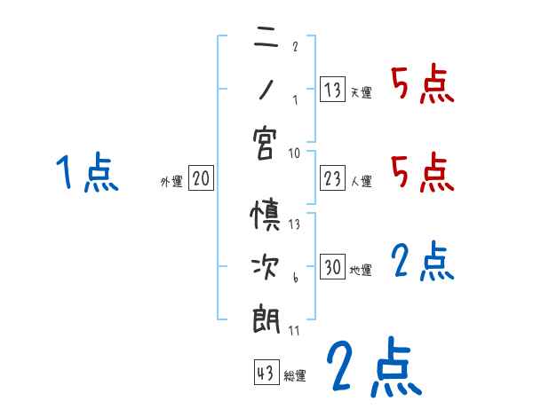 総運![]() | 二ノ宮慎次朗さんの総運は43画の2つ星!頑固な性格で独立心が強いかも。やや非現実的で浪費に注意しましょう。 あなたの人生を表す1番重要な運勢です。生涯を通じて影響する総合運となり、主に50歳以降の晩年期に影響を及ぼします。 |