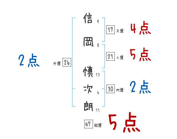 総運![]() | 信岡慎次朗さんの総運は47画の5つ星!実力が開花し発展する円満な人生。財に恵まれる。 あなたの人生を表す1番重要な運勢です。生涯を通じて影響する総合運となり、主に50歳以降の晩年期に影響を及ぼします。 |