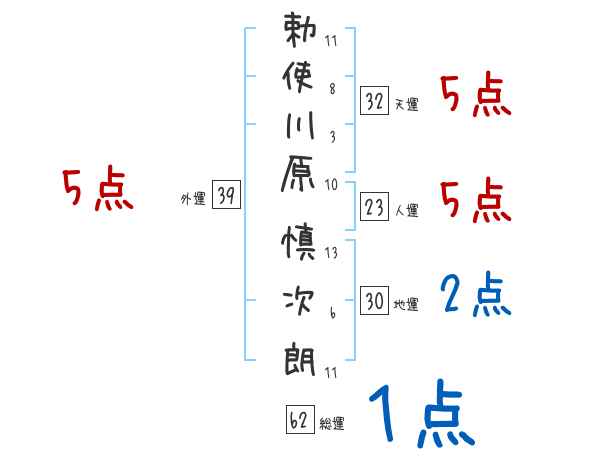 天運![]() | 勅使川原慎次朗さんの天運は32画の5つ星!柔軟性があり成功する。チャンスが多く金運が良い。 家系が持つ宿命的な運勢を表します。祖先から受け継いだ苗字ですので自分の力が及びません。家柄を象徴します。 |