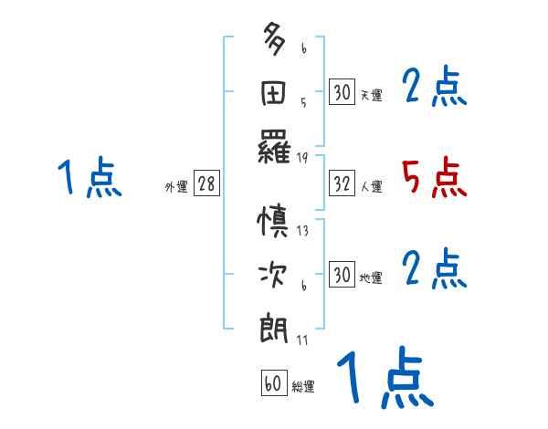 天運![]() | 多田羅慎次朗さんの天運は30画の2つ星!浮き沈みの激しさに注意しましょう。 家系が持つ宿命的な運勢を表します。祖先から受け継いだ苗字ですので自分の力が及びません。家柄を象徴します。 |