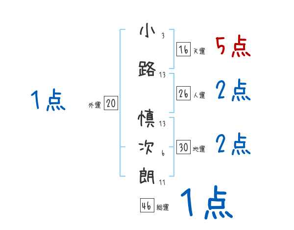 総運![]() | 小路慎次朗さんの総運は46画の1つ星!迷走することが多く苦労するかも。目先のことにとらわれないように。 あなたの人生を表す1番重要な運勢です。生涯を通じて影響する総合運となり、主に50歳以降の晩年期に影響を及ぼします。 |