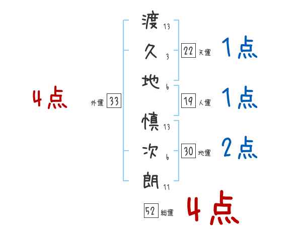 総運![]() | 渡久地慎次朗さんの総運は52画の4つ星!先見性と独創性に優れ考える力がある。強運の持ち主。 あなたの人生を表す1番重要な運勢です。生涯を通じて影響する総合運となり、主に50歳以降の晩年期に影響を及ぼします。 |