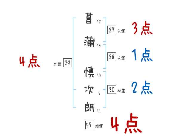 外運![]() | 菖蒲慎次朗さんの外運は29画の4つ星!完全主義で才能がある。厳格な心の持ち主。 生活面を象徴する運勢です。外部から受ける影響力を表し、結婚運、家庭運や職場、環境への順応性を表します。 |