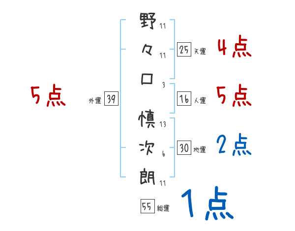 人運![]() | 野々口慎次朗さんの人運は16画の5つ星!人望が厚く大きく発展する。逆転成功が見える。 性格や才能などを表す2番目に重要な運勢です。人間関係や協調性、社会的な成功に影響します。主に20歳から50歳ぐらいまでの中年期の運勢を表します。 |