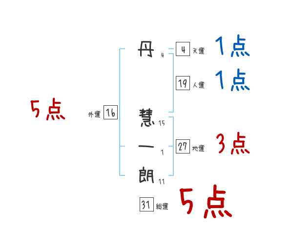 外運![]() | 丹慧一朗さんの外運は16画の5つ星!人望が厚く大きく発展する。逆転成功が見える。 生活面を象徴する運勢です。外部から受ける影響力を表し、結婚運、家庭運や職場、環境への順応性を表します。 |