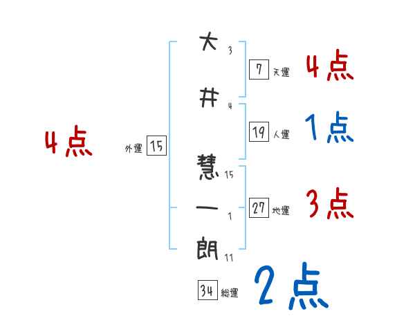 外運![]() | 大井慧一朗さんの外運は15画の4つ星!人徳があり出世する。順調に物事を進め円満な人生。 生活面を象徴する運勢です。外部から受ける影響力を表し、結婚運、家庭運や職場、環境への順応性を表します。 |