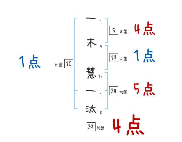 天運![]() | 一木慧一汰さんの天運は5画の4つ星!健康で安泰。協調性に優れ、財産に恵まれる。 家系が持つ宿命的な運勢を表します。祖先から受け継いだ苗字ですので自分の力が及びません。家柄を象徴します。 |