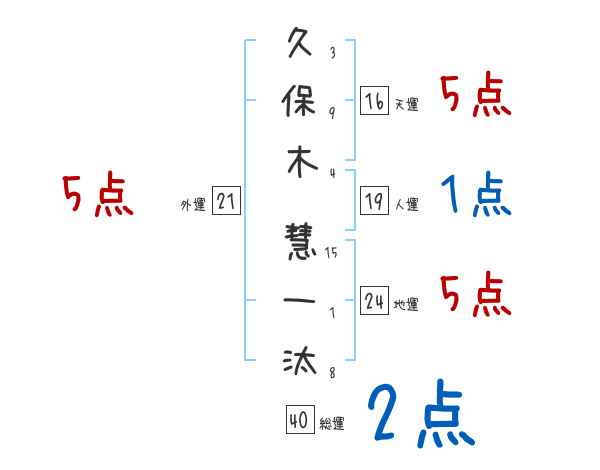 外運![]() | 久保木慧一汰さんの外運は21画の5つ星!統率力がある。独立し成功する。名誉を手に入れる。 生活面を象徴する運勢です。外部から受ける影響力を表し、結婚運、家庭運や職場、環境への順応性を表します。 |