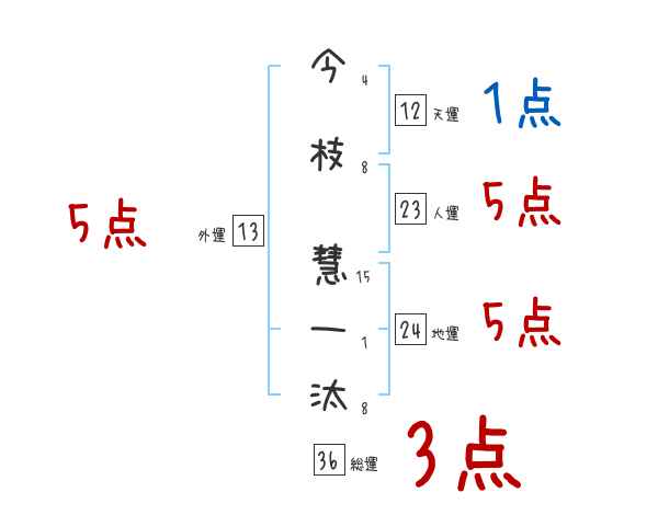 総運![]() | 今枝慧一汰さんの総運は36画の3つ星!先見性が豊かです。多少神経質で苦労することも。 あなたの人生を表す1番重要な運勢です。生涯を通じて影響する総合運となり、主に50歳以降の晩年期に影響を及ぼします。 |
