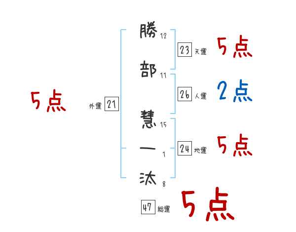 総運![]() | 勝部慧一汰さんの総運は47画の5つ星!実力が開花し発展する円満な人生。財に恵まれる。 あなたの人生を表す1番重要な運勢です。生涯を通じて影響する総合運となり、主に50歳以降の晩年期に影響を及ぼします。 |