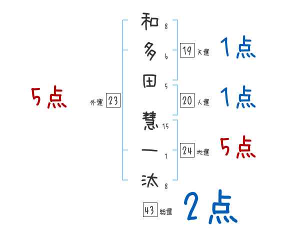 外運![]() | 和多田慧一汰さんの外運は23画の5つ星!想像力に優れ活力がある。一代で成功し名誉を手に入れる。 生活面を象徴する運勢です。外部から受ける影響力を表し、結婚運、家庭運や職場、環境への順応性を表します。 |