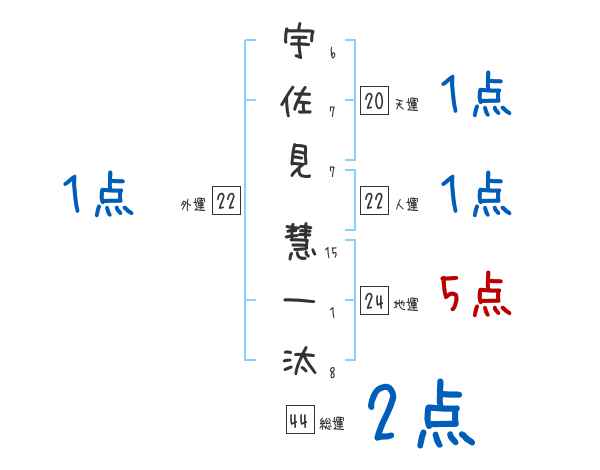 総運![]() | 宇佐見慧一汰さんの総運は44画の2つ星!誠実で慎重な性格。物事を考えすぎないように注意しましょう。 あなたの人生を表す1番重要な運勢です。生涯を通じて影響する総合運となり、主に50歳以降の晩年期に影響を及ぼします。 |