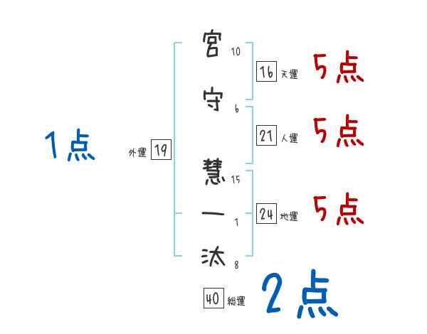 天運![]() | 宮守慧一汰さんの天運は16画の5つ星!人望が厚く大きく発展する。逆転成功が見える。 家系が持つ宿命的な運勢を表します。祖先から受け継いだ苗字ですので自分の力が及びません。家柄を象徴します。 |
