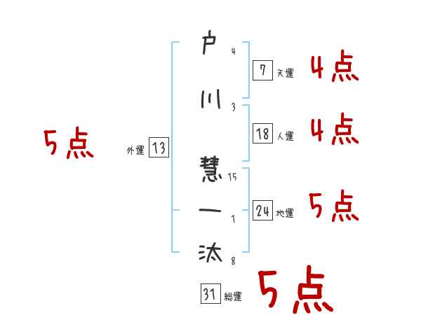 天運![]() | 戸川慧一汰さんの天運は7画の4つ星!強い意志や信念を持ち独立心が強い。自立する。 家系が持つ宿命的な運勢を表します。祖先から受け継いだ苗字ですので自分の力が及びません。家柄を象徴します。 |