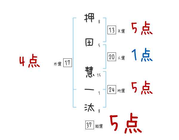 天運![]() | 押田慧一汰さんの天運は13画の5つ星!才能に恵まれ人気がある。名声を手に入れる。円満な人生。 家系が持つ宿命的な運勢を表します。祖先から受け継いだ苗字ですので自分の力が及びません。家柄を象徴します。 |