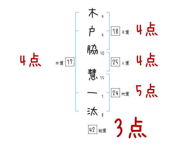 天運![]() | 木戸脇慧一汰さんの天運は18画の4つ星!情熱的で剛気。忍耐力があり信頼される。 家系が持つ宿命的な運勢を表します。祖先から受け継いだ苗字ですので自分の力が及びません。家柄を象徴します。 |