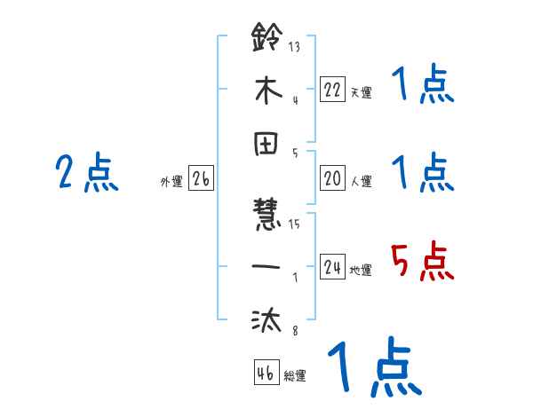 総運![]() | 鈴木田慧一汰さんの総運は46画の1つ星!迷走することが多く苦労するかも。目先のことにとらわれないように。 あなたの人生を表す1番重要な運勢です。生涯を通じて影響する総合運となり、主に50歳以降の晩年期に影響を及ぼします。 |