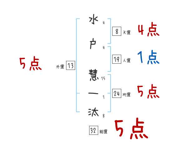 総運![]() | 水戸慧一汰さんの総運は32画の5つ星!柔軟性があり成功する。チャンスが多く金運が良い。 あなたの人生を表す1番重要な運勢です。生涯を通じて影響する総合運となり、主に50歳以降の晩年期に影響を及ぼします。 |