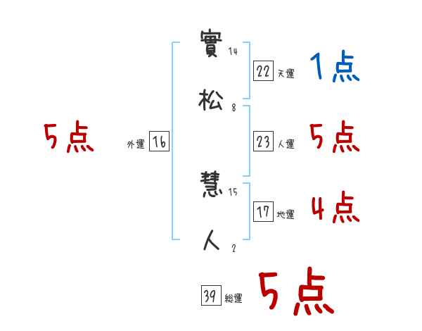 総運![]() | 實松慧人さんの総運は39画の5つ星!社交性に優れ人望が厚い。人の上に立ち成功する。 あなたの人生を表す1番重要な運勢です。生涯を通じて影響する総合運となり、主に50歳以降の晩年期に影響を及ぼします。 |