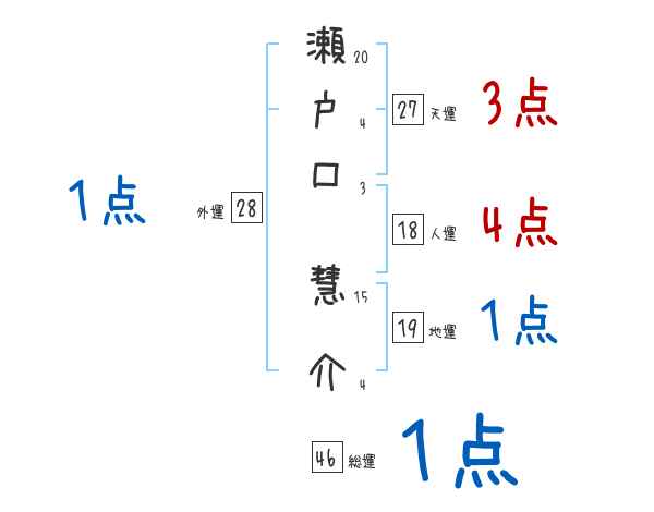 総運![]() | 瀬戸口慧介さんの総運は46画の1つ星!迷走することが多く苦労するかも。目先のことにとらわれないように。 あなたの人生を表す1番重要な運勢です。生涯を通じて影響する総合運となり、主に50歳以降の晩年期に影響を及ぼします。 |
