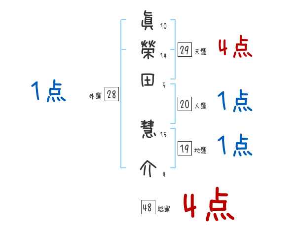 天運![]() | 眞榮田慧介さんの天運は29画の4つ星!完全主義で才能がある。厳格な心の持ち主。 家系が持つ宿命的な運勢を表します。祖先から受け継いだ苗字ですので自分の力が及びません。家柄を象徴します。 |