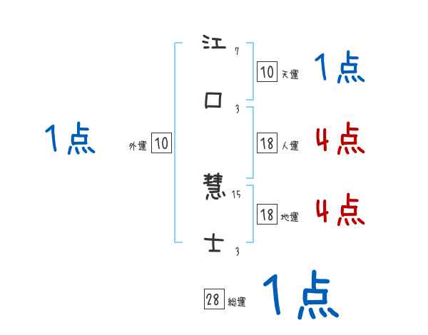 総運![]() | 江口慧士さんの総運は28画の1つ星!家庭環境に注意。スポーツで活躍できる能力があるかも。 あなたの人生を表す1番重要な運勢です。生涯を通じて影響する総合運となり、主に50歳以降の晩年期に影響を及ぼします。 |