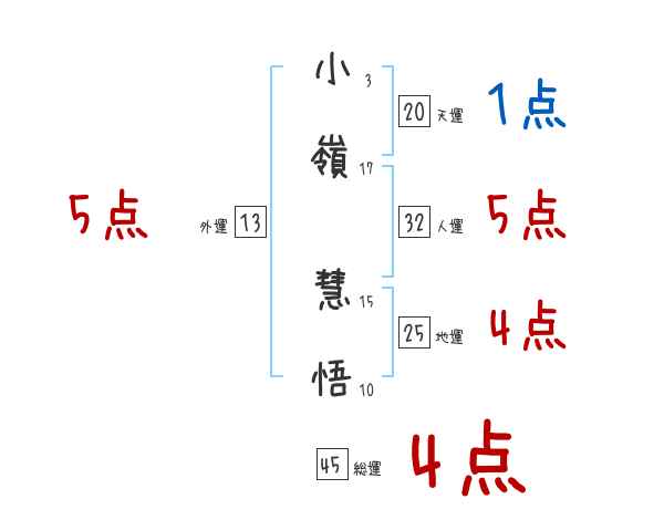 人運![]() | 小嶺慧悟さんの人運は32画の5つ星!柔軟性があり成功する。チャンスが多く金運が良い。 性格や才能などを表す2番目に重要な運勢です。人間関係や協調性、社会的な成功に影響します。主に20歳から50歳ぐらいまでの中年期の運勢を表します。 |